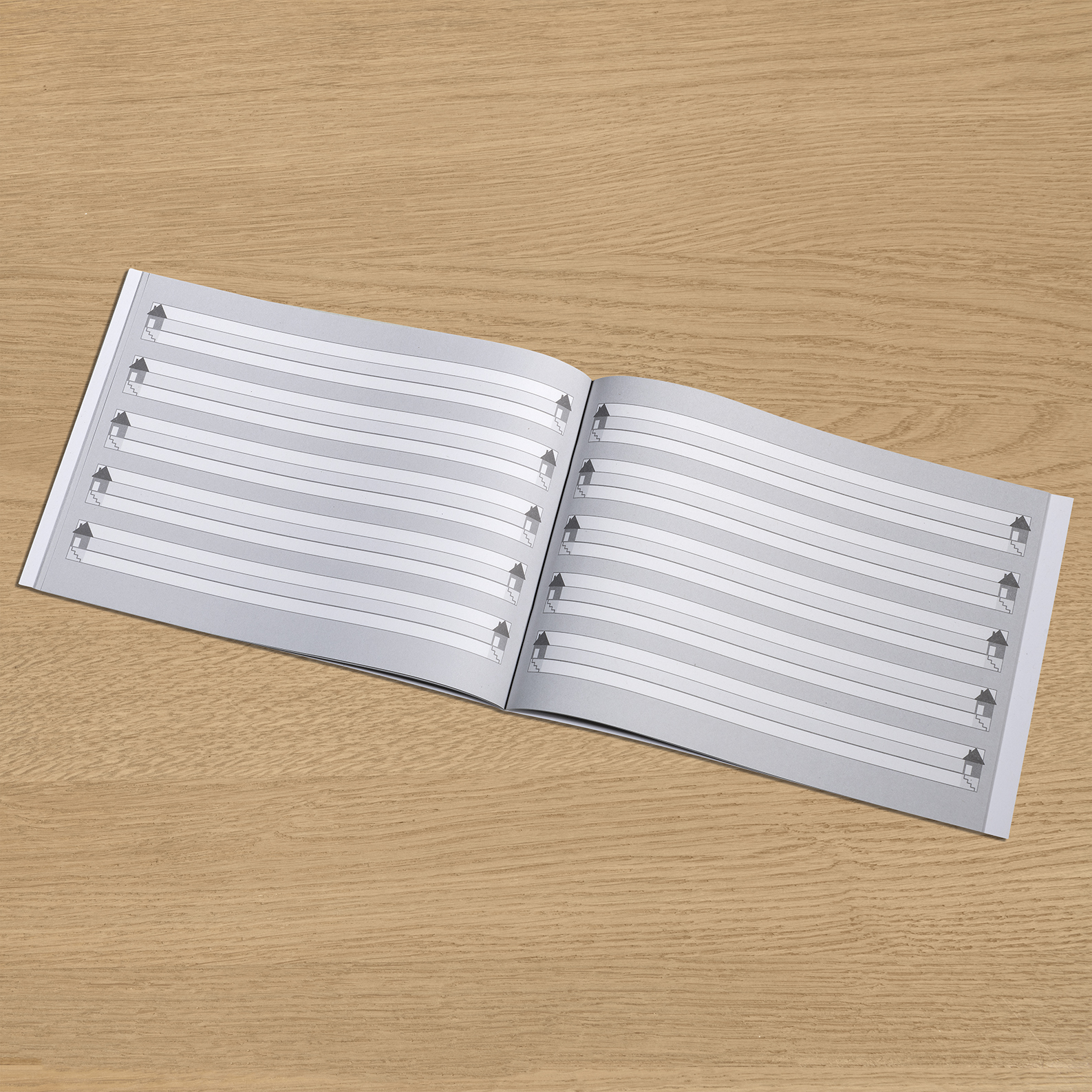 DIN-A5 Schreiblernheft quer mit hervorgehobener Mittelzeile und Häuschen rechts und links, Lineatur 0